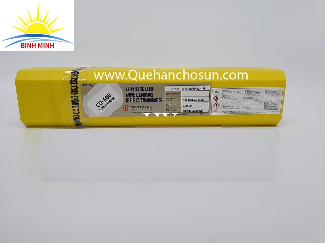 Que hàn đắp chống mài mòn Chosun CD-600 Dùng để hàn đắp làm cứng bề mặt khuôn ép, khuôn kim loại rèn, thép dụng cụ và các chi tiết đã được tôi cứng bằng phương pháp tôi.